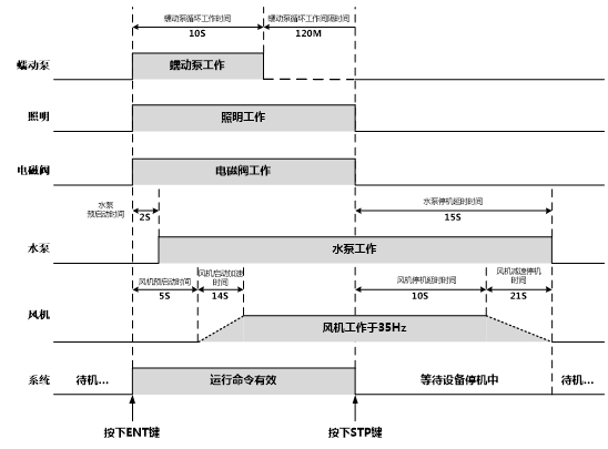 (2) 停機(jī)時,照明同時關(guān)閉,10秒后關(guān)閉風(fēng)機(jī),再5秒后關(guān)閉水泵。
