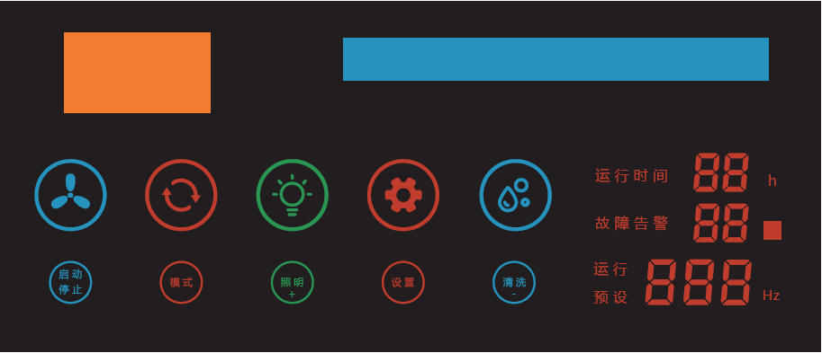 其中,橙色區(qū)域為LOGO展示區(qū)域,用以展示廠家定制的LOGO圖標(biāo);藍(lán)色區(qū)域為廠家名稱顯示區(qū)域。其他按鍵指示燈定義如下: