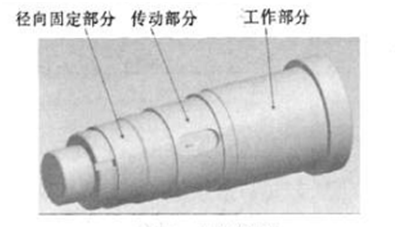 數(shù)控立式機床的主軸設(shè)計采用短粗型結(jié)構(gòu),將主軸分為三個部分,即工作部分、傳動部分和徑向固定部分,在主軸的設(shè)計過程中,為了保證力矩的有效傳遞,一般將工作部分放在最上面,傳動部分在中間,徑向固定部分在最低端,結(jié)構(gòu)如圖所示:
