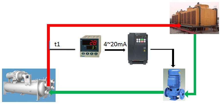 (2) 對于冷卻水系統(tǒng),由于低溫冷卻水溫度取決于冷卻塔的工況,我們只需要控制高溫冷卻水(冷凝器回水)的溫度,即可控制溫差?,F(xiàn)采用溫度傳感器、PID溫差調(diào)節(jié)器和變頻器組成閉環(huán)控制系統(tǒng),通過對冷凝器的回水溫度(t1≤37℃)進(jìn)行控制,實(shí)現(xiàn)冷卻水泵的轉(zhuǎn)速調(diào)節(jié)。