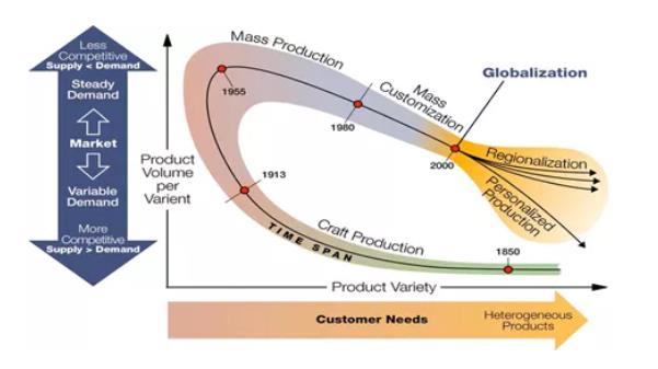 (1)隨著客戶需求的個(gè)性化和制造技術(shù)的發(fā)展進(jìn)化,制造模式已經(jīng)從大批量生產(chǎn)走向大批量定制和個(gè)性化定制;