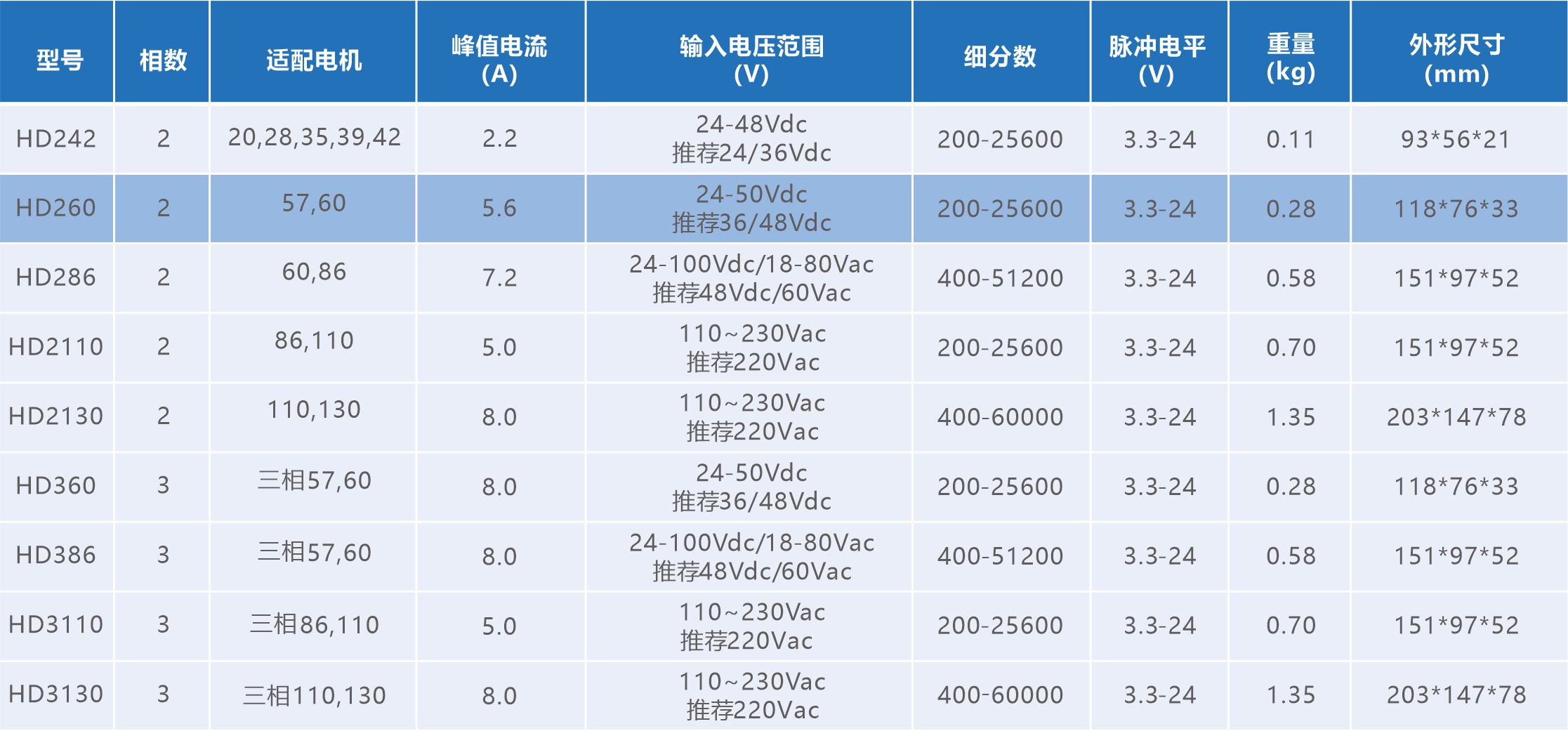 HD260 開(kāi)環(huán)步進(jìn)驅(qū)動(dòng)器HD260 步進(jìn)驅(qū)動(dòng)器,基于32 位 DSP 處理芯片的平臺(tái),采用內(nèi)部 PID 電流控制算法設(shè)計(jì),具有優(yōu)異的性能表現(xiàn)。內(nèi)置微細(xì)分技術(shù)使得 HD260步進(jìn)驅(qū)動(dòng)器具有低噪音、低振動(dòng)、低發(fā)熱和高速大力矩輸出的特點(diǎn),能夠很好的適應(yīng)于步進(jìn)電機(jī)的大部分運(yùn)用場(chǎng)合。 HD260 步進(jìn)驅(qū)動(dòng)器可通過(guò)撥碼開(kāi)關(guān)選擇運(yùn)行電流和細(xì)分,有 16 種細(xì)分、8 種電流選擇, 具有過(guò)壓,欠壓,過(guò)電流流保護(hù),其輸入輸出控制信號(hào)均采用光電隔離。