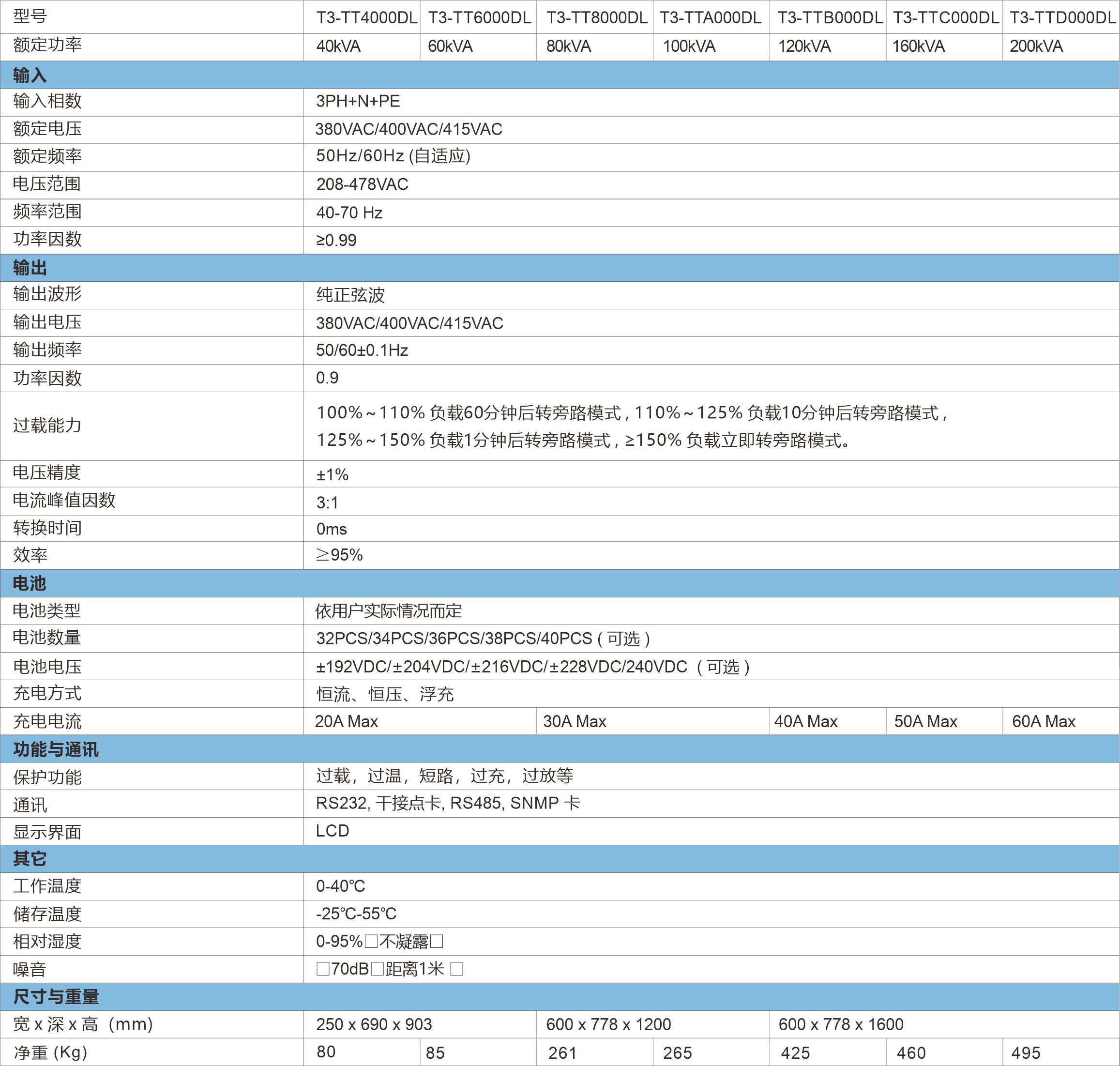 T3 系列在線式高頻UPS 40kVA-200kVA(3/3)T3 系列在線高頻智能化 UPS,作為電源供給和保護的關鍵設備,采用雙變換設計、DSP 數(shù)字控制,集成輸入功率因數(shù)校正技術,對電網(wǎng)斷電、振蕩、干擾等狀況,提供良好的解決方案。保證更加優(yōu)良的輸出性能,滿足設備需求。