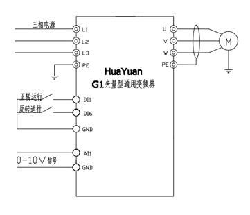本方案采用G1系列18.5kW矢量型通用變頻器驅(qū)動車床主軸15kW電動機,V/F控制,模擬量(0 ~ 10V)給定頻率,外部端子啟停,故障信號輸出。