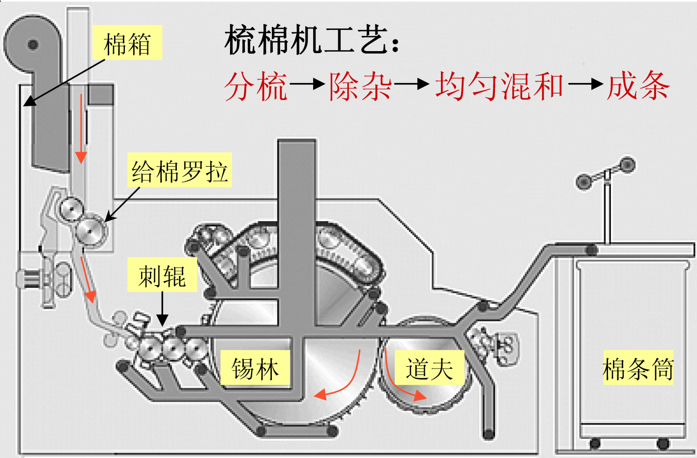 梳棉機是介于開清棉聯(lián)合機和并條機之間,主要是用來加工棉纖維和化學(xué)纖維的一種棉紡織機械。通過將上道工序開清棉聯(lián)合機送來的棉(化纖)層進行開松分梳除雜,使所有呈卷曲、塊狀的棉團成為基本伸直的單纖維狀態(tài),并在此過程中,除掉清花工序遺留下來的破籽、雜質(zhì)和短絨,然后集束成一定規(guī)格的棉條,儲存于條筒內(nèi),供并條工序使用。