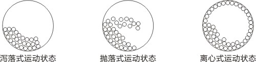 球磨機(jī)一般以固定轉(zhuǎn)速運(yùn)行,筒體的轉(zhuǎn)速是由皮帶輪或齒輪減速機(jī)構(gòu)決定的。球磨機(jī)的轉(zhuǎn)速直接影響到鋼球和物料的運(yùn)動(dòng)狀況及物料的研磨過(guò)程,在不同的轉(zhuǎn)速下,筒體內(nèi)的鋼球和物料的運(yùn)動(dòng)狀態(tài)如下圖所示: