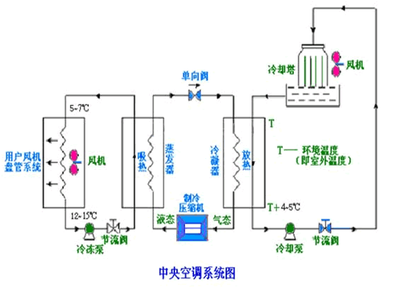 由冷卻水泵,冷卻水管道及冷卻塔組成,制冷機(jī)組進(jìn)行熱交換使水溫冷卻的同時(shí),必將釋放大量的熱量;該熱量被冷卻水吸收,使冷卻水溫度升高。冷卻泵將升了溫的冷卻水壓入冷卻塔,使之在冷卻塔與大氣進(jìn)行熱交換,然后再將降了溫的冷卻水,送回到冷卻機(jī)組。如此不斷循環(huán),帶走了冷凍機(jī)組釋放的熱量。流進(jìn)冷凍機(jī)組的冷卻水稱為“進(jìn)水”,從冷凍機(jī)組流回冷卻塔的冷卻水稱為“回水”。