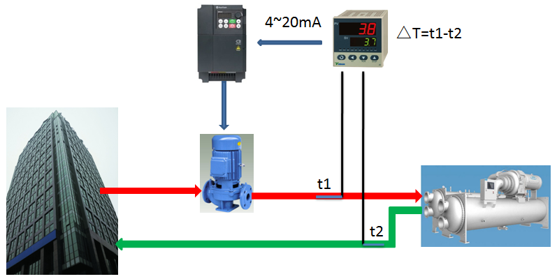 (1) 對于冷凍水系統(tǒng),出水溫度取決于蒸發(fā)器的設(shè)定值,回水溫度取決于蒸發(fā)器接受的熱量,中央空調(diào)冷凍水出水溫度與回水溫度設(shè)計(jì)溫差為5℃(例如出水7℃,回水12℃)。現(xiàn)采用在蒸發(fā)器的出水管和回水管路上安裝溫度傳感器,并與PID溫差調(diào)節(jié)器和變頻器組成閉環(huán)控制系統(tǒng),通過對溫差的控制,實(shí)現(xiàn)冷凍水泵的轉(zhuǎn)速調(diào)節(jié),以適應(yīng)主機(jī)負(fù)荷的變化。
